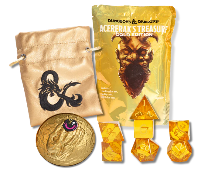 Unlock the mysteries of the Dungeons & Dragons Acererak's Treasure Packs: Gold Edition, where every pack is a gateway to a D&D adventure. Each pack contains a full 7-piece dice set, a metal ability coin, and a quality embroidered D&D bag. Be on the hunt for only 50 SUPER LEGENDARY Gold Packs!